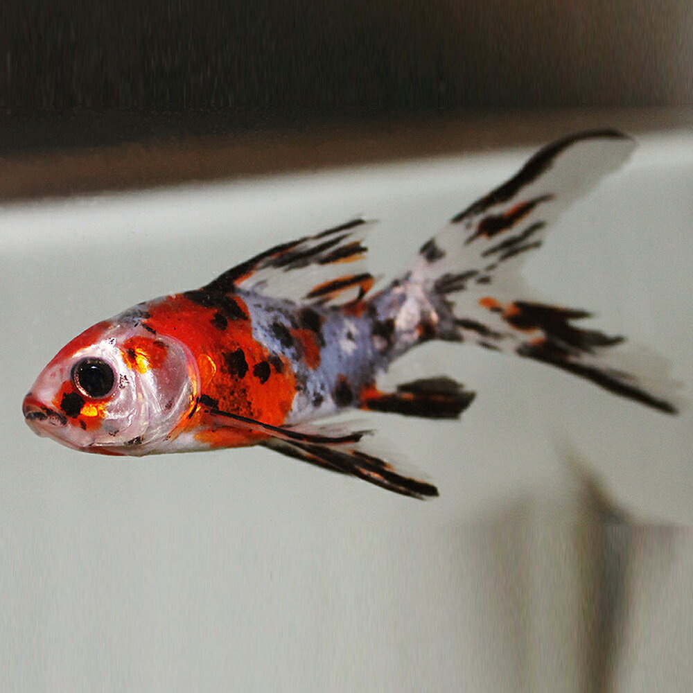 和金型の体型に長い尾、体色が赤、青、白、黒の和を感じさせる渋い雑色の味わい深い品種である。