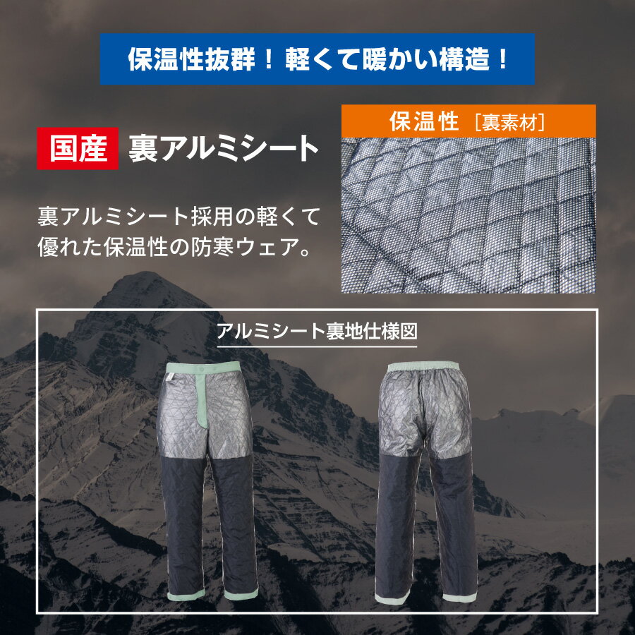 裏アルミシートを使用することで軽くて暖かい! 優れた保温性の防寒ウェア。