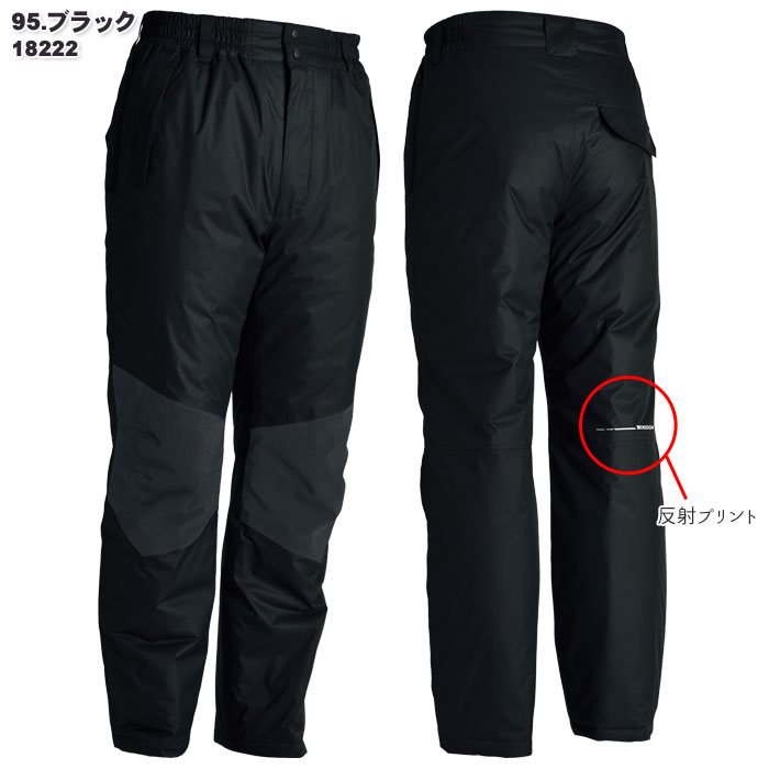 ・シーンを選ばないベーシックなデザイン・雨や風の侵入を完全にシャットアウトする防風・防水性・保温性に優れた軽量中綿・体から外へ逃げる熱を皮膚へと再反射し保温性を高め、衣服にこもった汗の水蒸気を素早く対外へ放出する透湿性を併せ持つハイブリッド素材 ■品名・品番 メガヒート 防水防寒パンツ(ユニセックス/男女兼用) 18222 ■カラー 95.ブラック ■サイズ S M L LL 3L 4L 5L 6L ※S〜4Lについてはこちらからご購入いただけます。